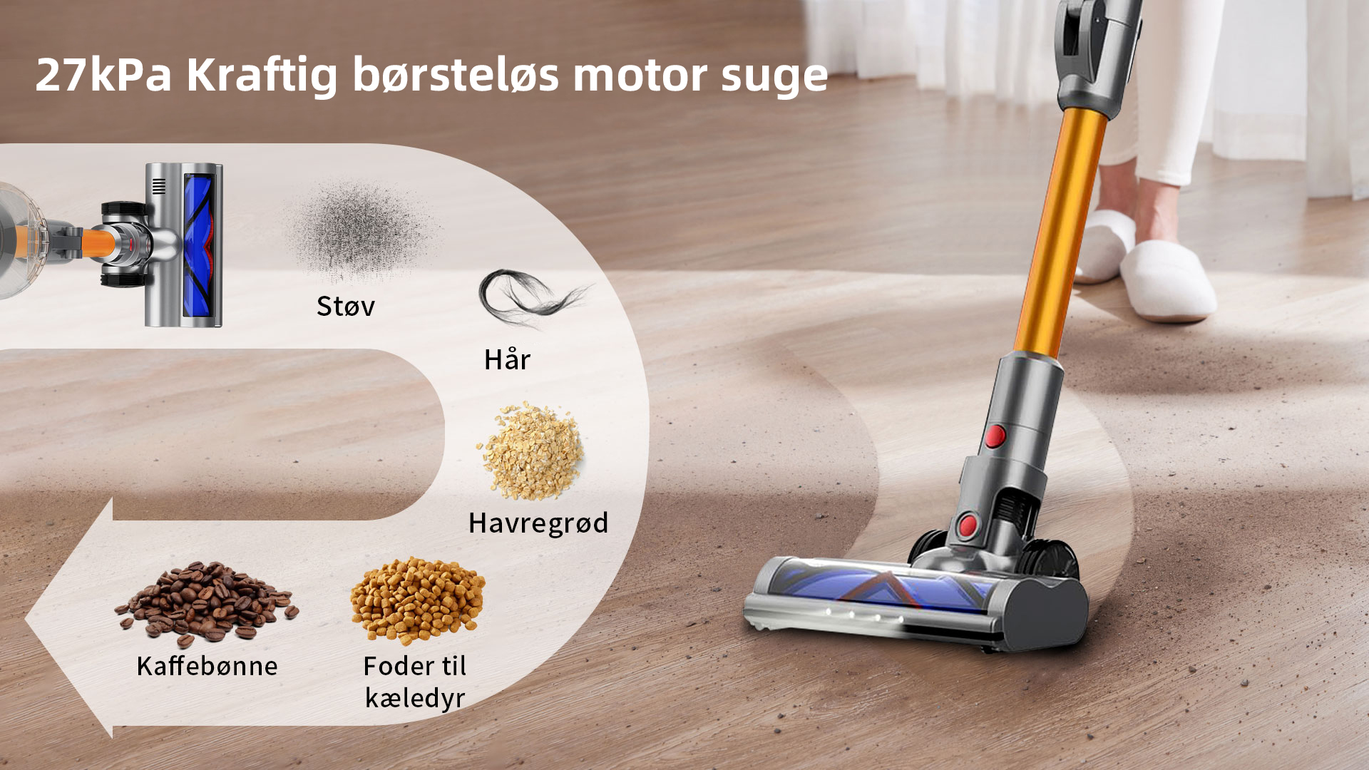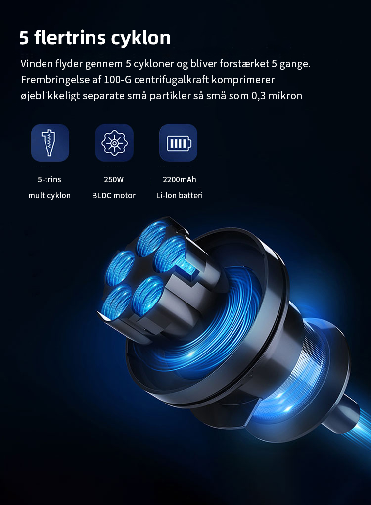 Kraftfulde X9-motor roterer med mere end 135.000 omdrejninger i minuttet, hvilket skaber et sug på over 27.000 Pa. Den er næsten i stand til at suge alle typer af snavs op.