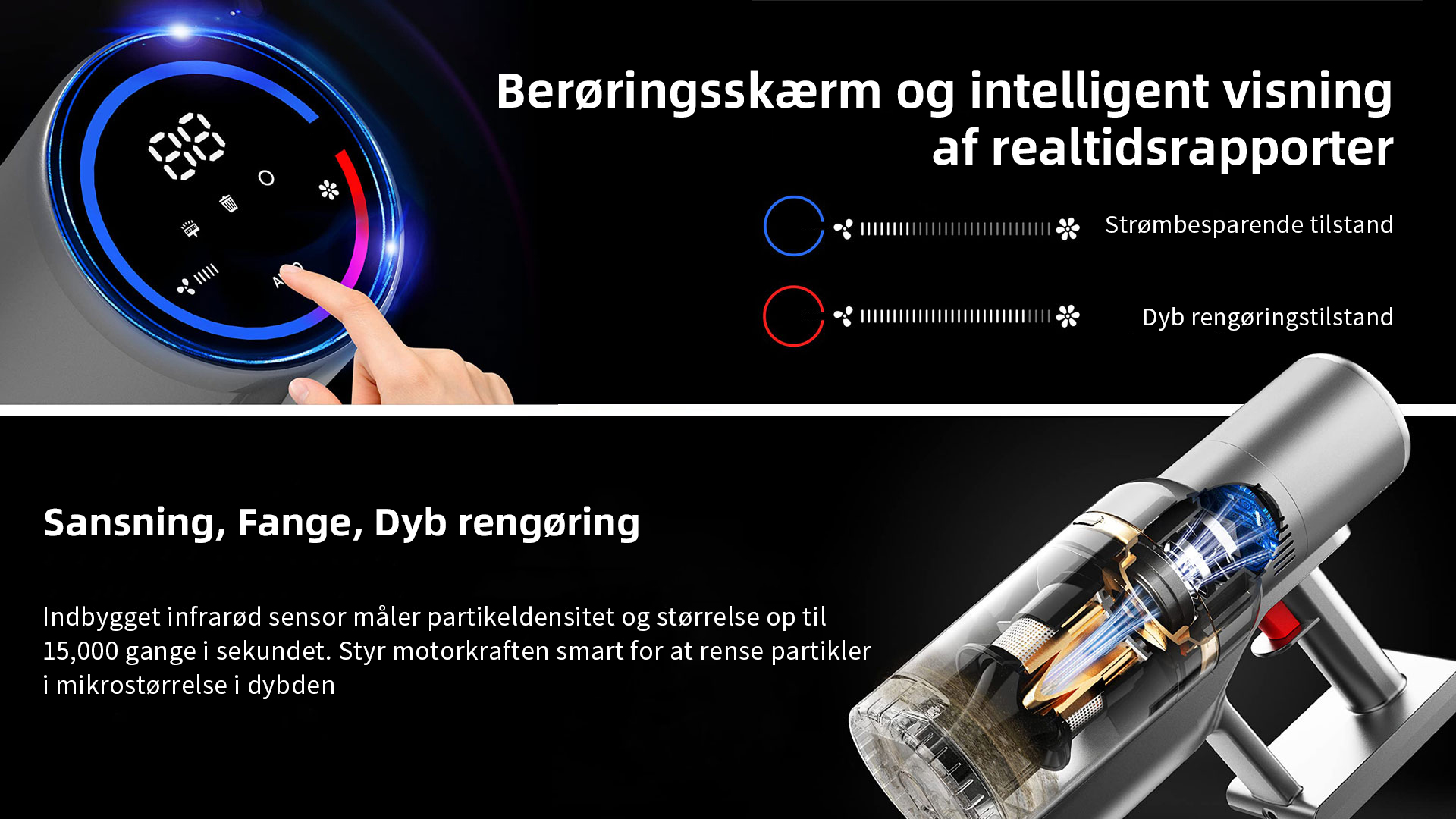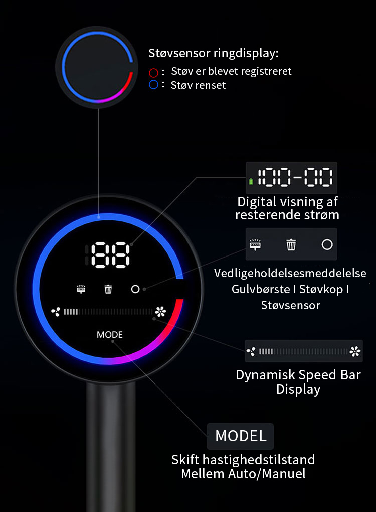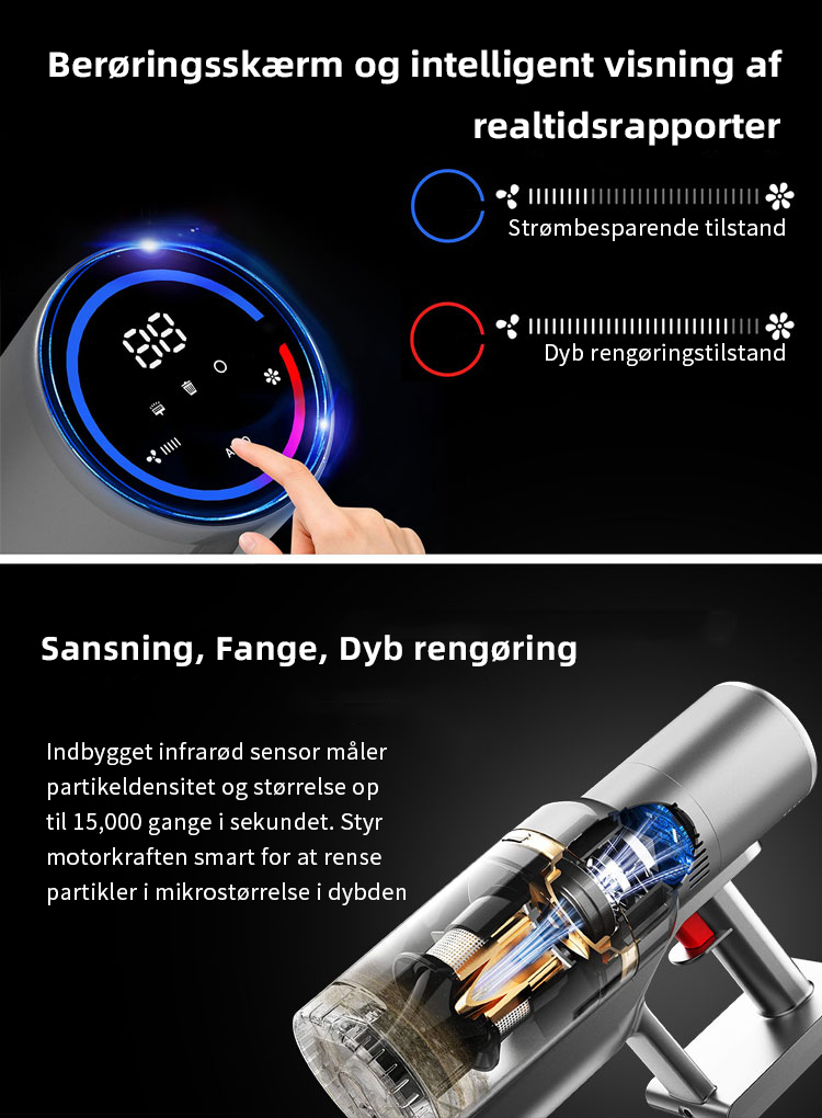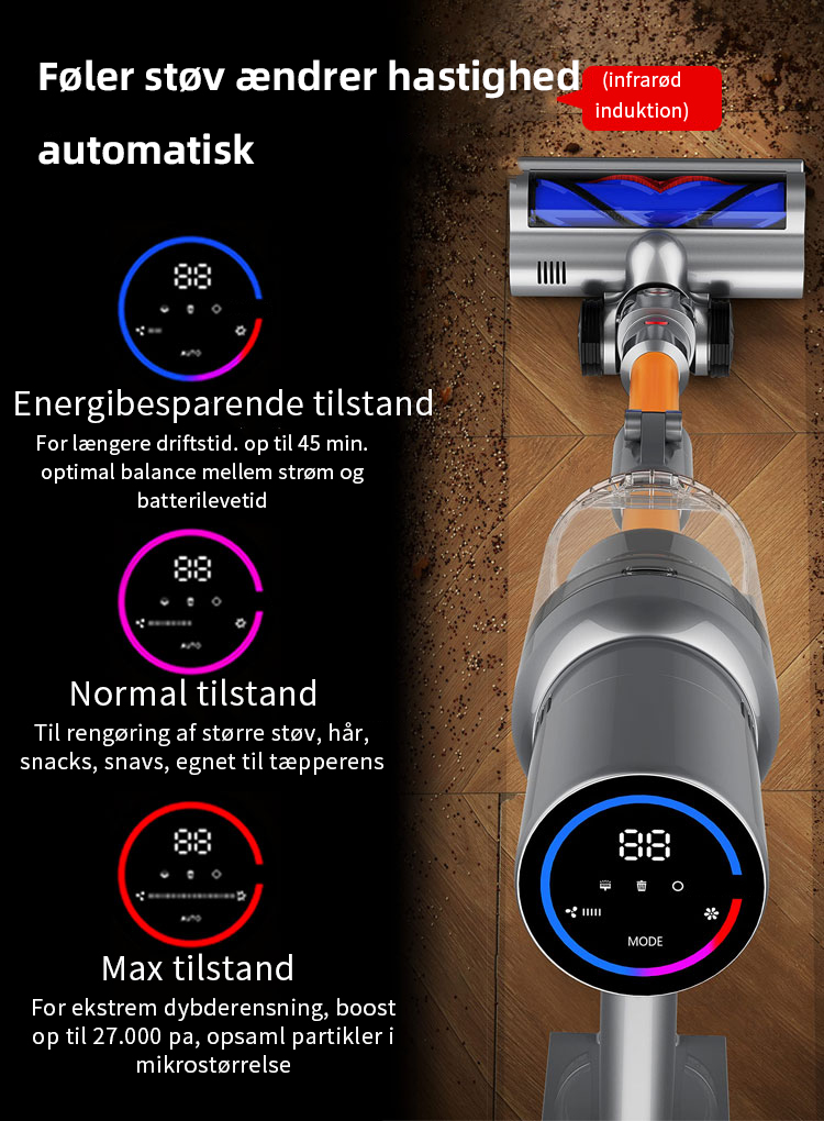 Trådløs stavstøvsuger er bygget med det nyeste Dust Smart Sensor System, som automatisk justerer sugekraften i Auto Mode baseret på mængden af snavs og støv, der registreres for at opnå optimale rengøringsresultater og samtidig maksimere driftstiden.