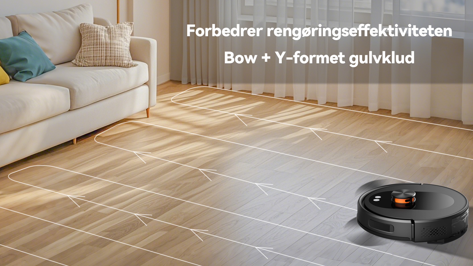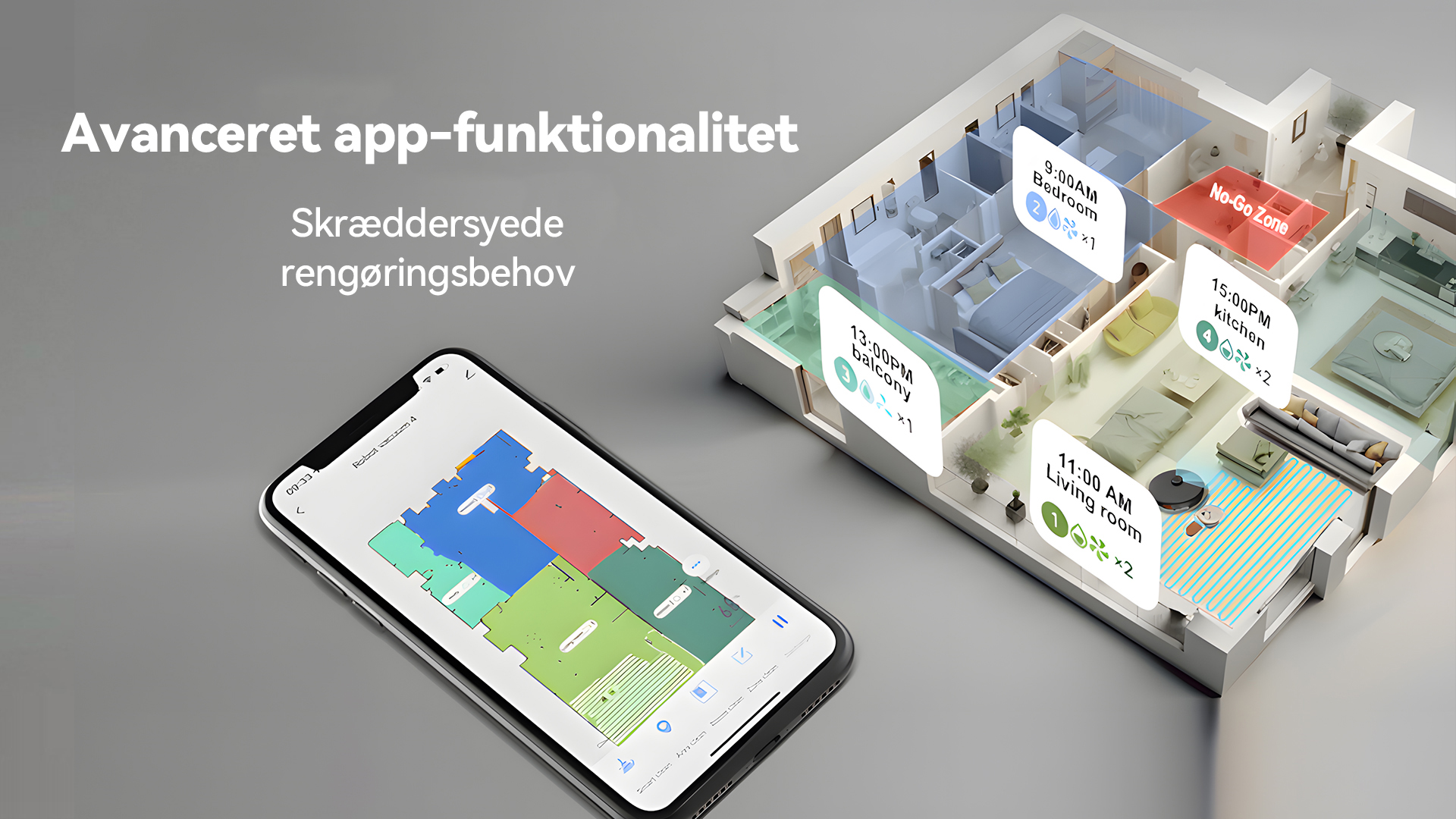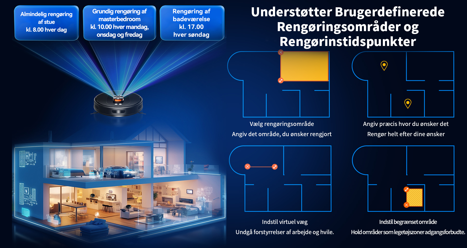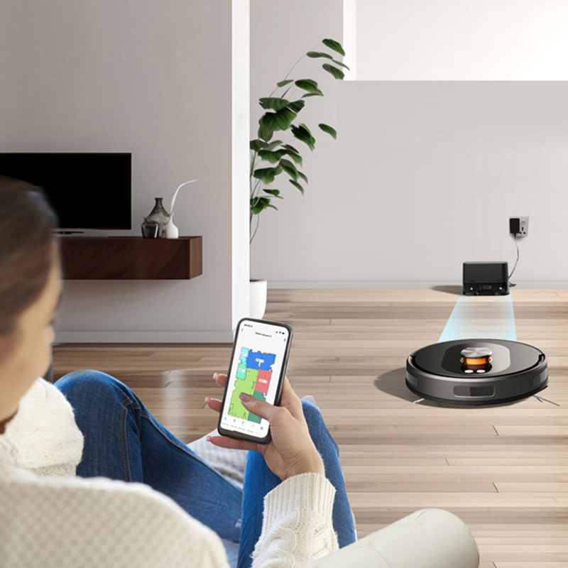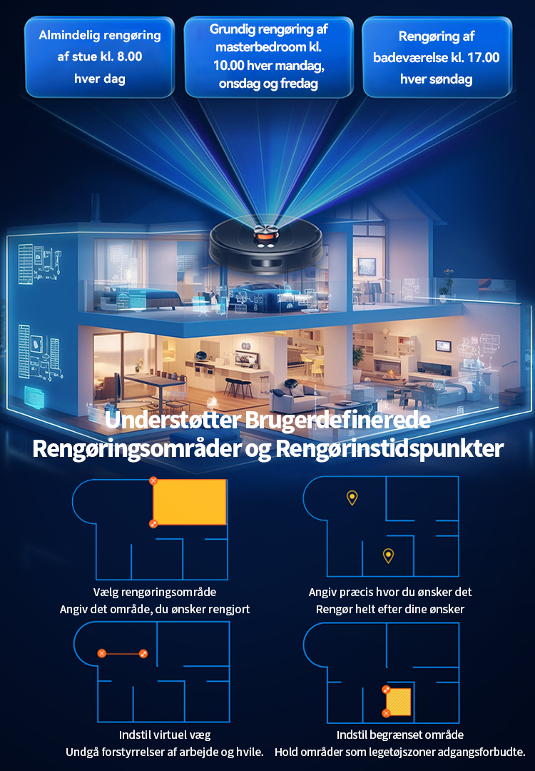 Det avancerede kortlægningssystem genkender automatisk de forskellige rum i dit hjem. Gennem appen kan du nemt vælge et rum, flere rum eller hele etagen for at støvsuge eller planlægge rengøring.