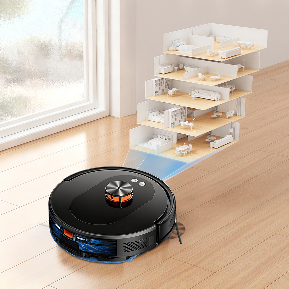 Vores robotstøvsuger administrerer flere kortlag. Du kan gemme flere plantegninger i appen uden at skulle skanne igen hver gang. Dette sparer tid og energi og forhindrer, at roboten sletter dit stueplanskort, mens den renser andre etager.