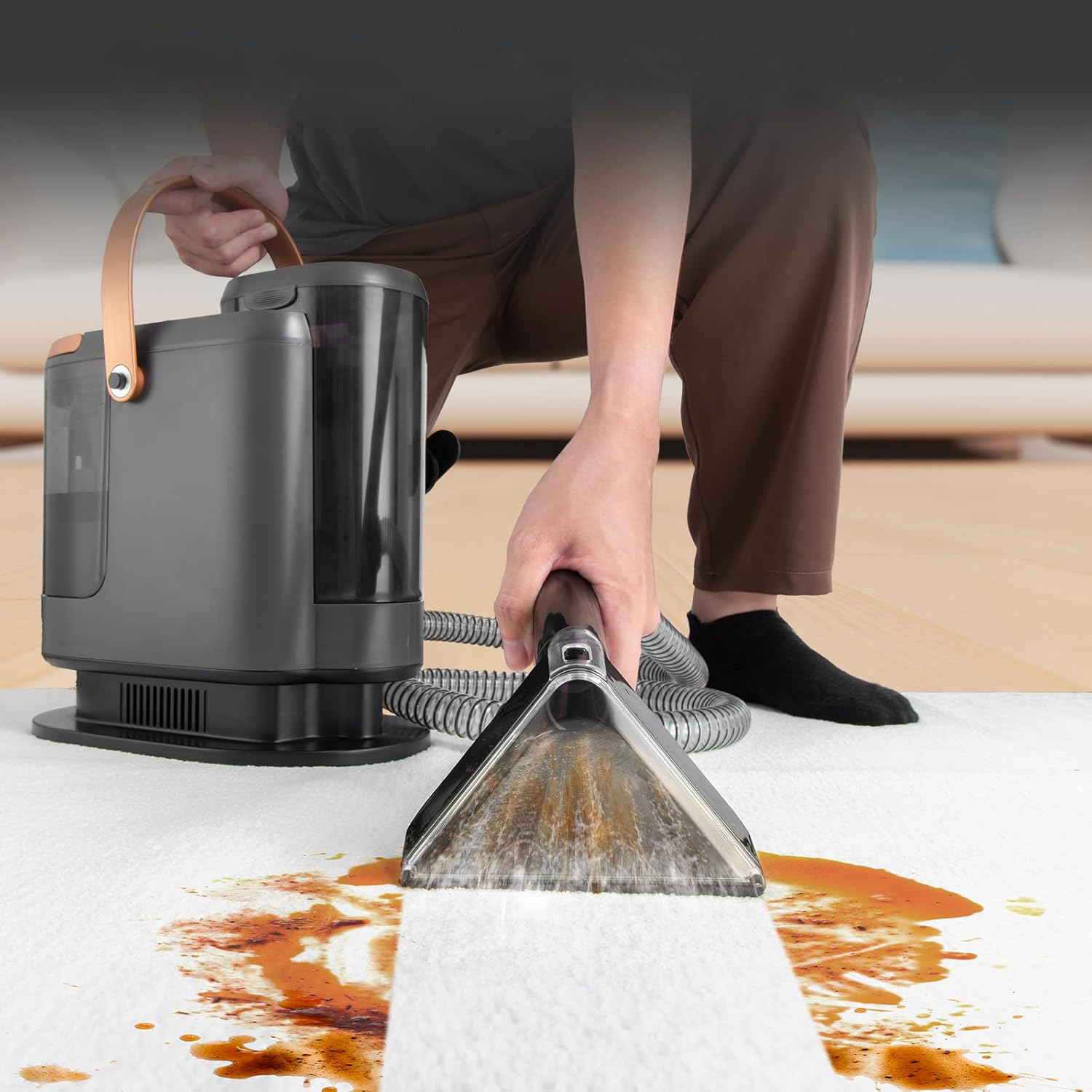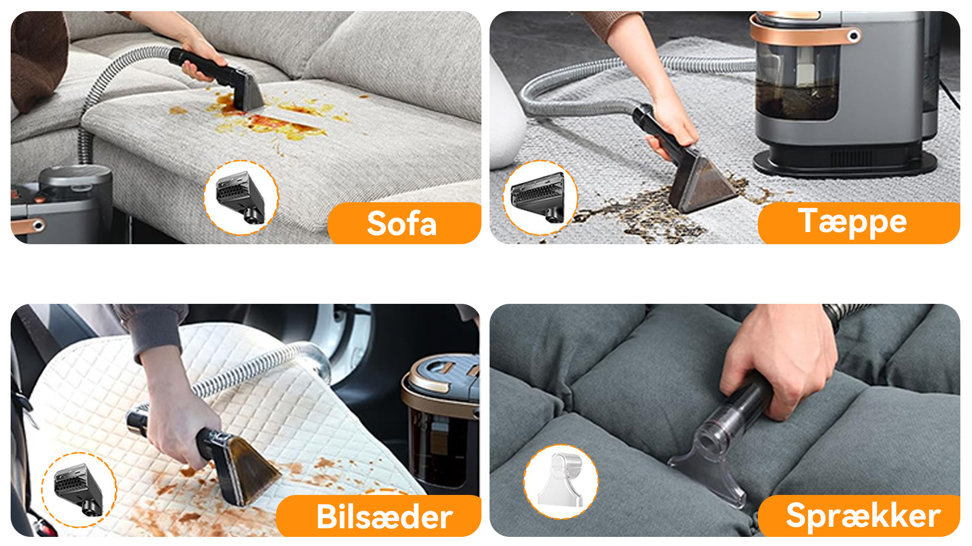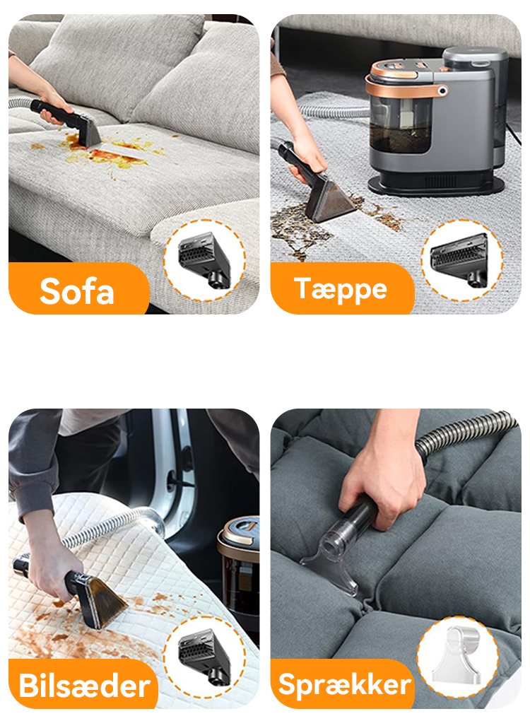Fra børnesnavsede madrasser og beskidte barnevogne til tæpper med dyreurin, snavsede sofaer og bilsæder – alt kan rengøres nemt og uden adskillelse. Vores tæpperensers højtryks-sprøjtefunktion og kraftige sugestyrke fremskynder rengøringsprocessen, mindsker brugerens belastning og sikrer et hurtigere og mere behageligt resultat.